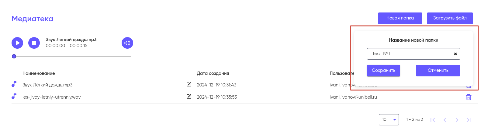 Медиатека служит для загрузки и хранения используемых в сценариях файлов в формате mp3 или wav.