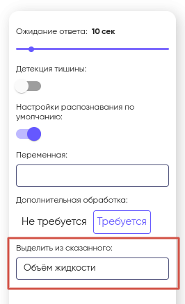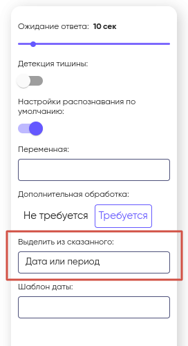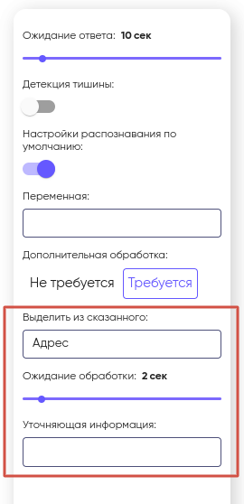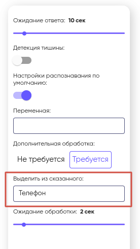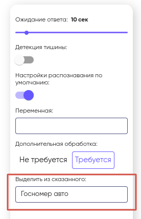 При использовании блока ‘Распознавание’ можно указать конкретные параметры для извлечения информации из предложенного списка, позволяющие выделить нужные элементы из высказывания абонента, такие как: