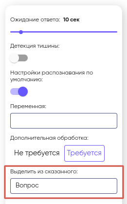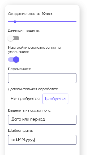 Выход из данного блока осуществляется по прошествии времени ожидания ответа, заданного в настройках, либо в момент, когда система определит окончание речи абонента, если установлен переключатель «Детекция тишины» (детектирование происходит приблизительно через 2−3 секунды).