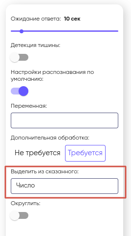 Выделяет из фразы абонента только то, что было выбрано в ‘Уточняющей информации’. Если было выбрано «ФИО», то распознанное будет записано в переменную в виде фразы.