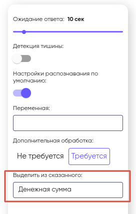 Для ее активации нажмите на “Требуется” и в выпадающем списке выберите тип контента, который необходимо выделить из речи абонента для сохранения в переменную.